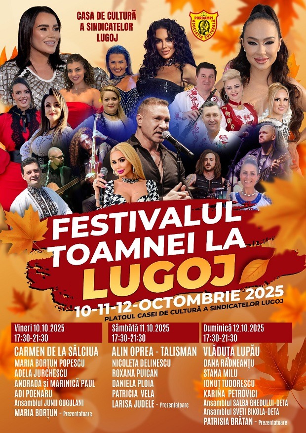 Lugojul îmbracă haine de sărbătoare! Între 10 și 12 octombrie 2025, pe platoul Casei de Cultură a Sindicatelor are loc Festivalul Toamnei și al Vinului. Evenimentul adună laolaltă muzică, dans, gastronomie locală și vinuri românești, într-un weekend care promite distracție și savoare.