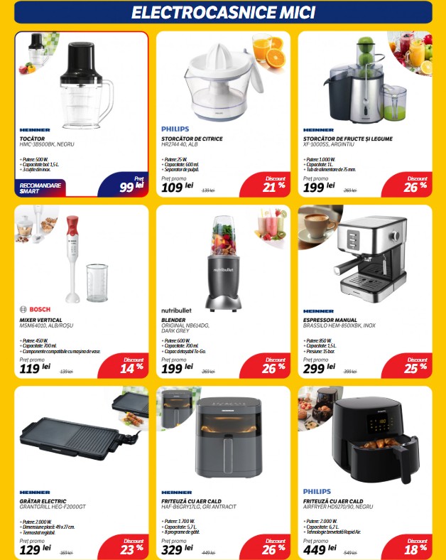 Fiecare aparat are un rol clar în bucătărie, iar în perioada asta chiar poți să le prinzi mai ieftin. Sunt reduceri între 14% și 26%, în funcție de produs. Catalogul e valabil de azi, deci dacă vrei să-ți îmbunătățești setup-ul culinar, ai de unde alege. Catalogul Flanco aduce reduceri bune pentru aparate de bucătărie, mai ales pentru cei cu buget restrâns și nevoi esențiale.