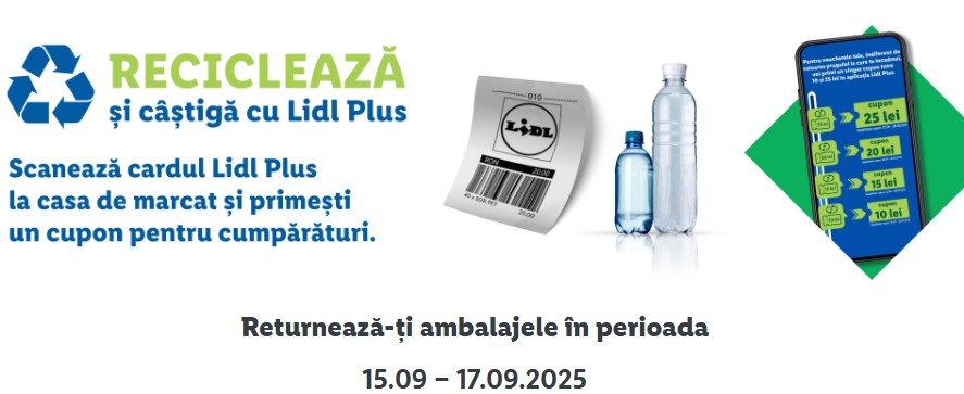 Lidl a lansat o campanie specială legată de reciclare. Este activă în toate magazinele între 15 și 17 septembrie 2025. Clienții care aduc ambalaje cu simbolul SGR le pot introduce în aparatele de colectare. Aparatele eliberează un voucher imediat.