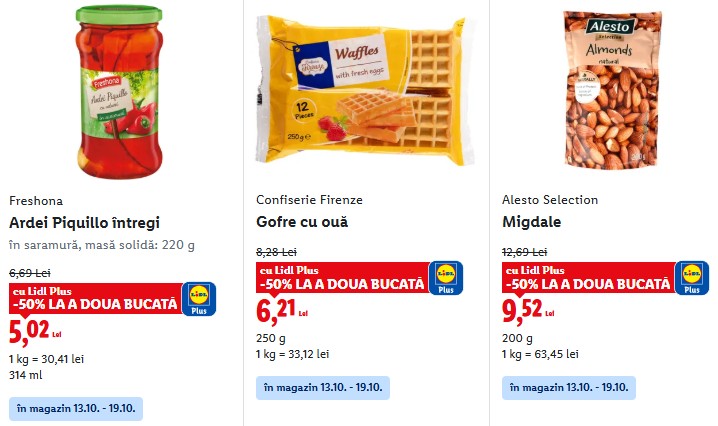 Găsești și migdale Alesto Selection, 200 g, la 9,52 lei, brânză Feta D.O.P. Milbona, 200 g, la 9,15 lei, sau rondele glazurate Sondey, 66 g, la 2,89 lei.