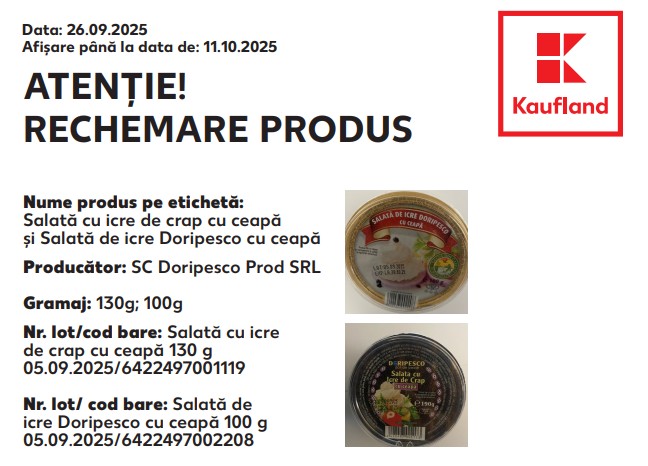 Un aliment consumat des de români a fost retras de la vânzare din magazinele Kaufland. Este vorba despre salata de icre de crap, produsă de SC Doripesco Prod SRL, vândută în ambalaj de 190 de grame.