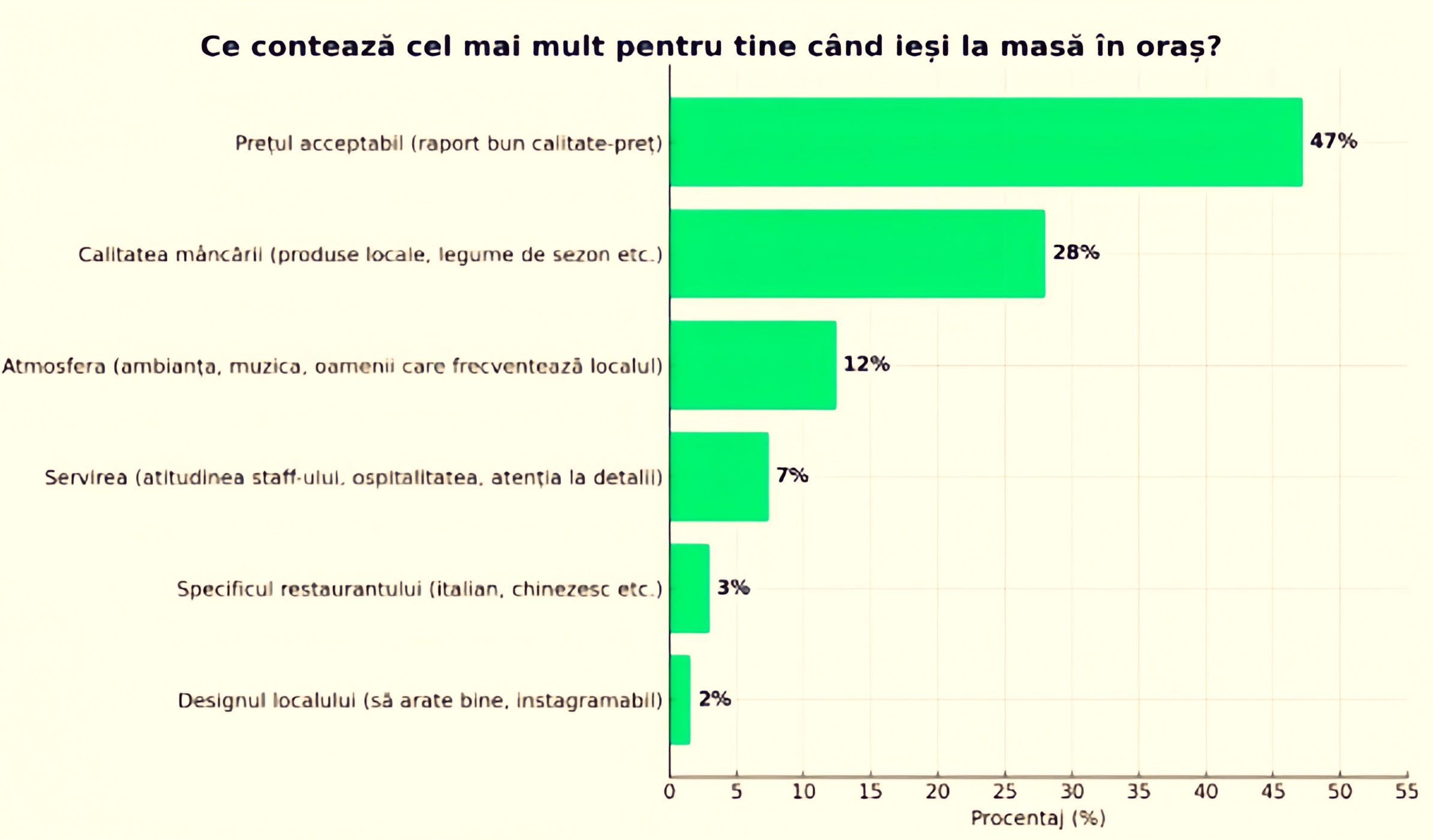În același timp, jumătate dintre români (47%) aleg localul în funcție de raportul calitate-preț, iar 28% pun accentul pe calitatea mâncării. Tinerii de 18-35 de ani ies mai des, dar sunt mai sensibili la prețuri. Cei peste 35 ies mai rar, dar rămân fideli localurilor care livrează constant servicii bune.