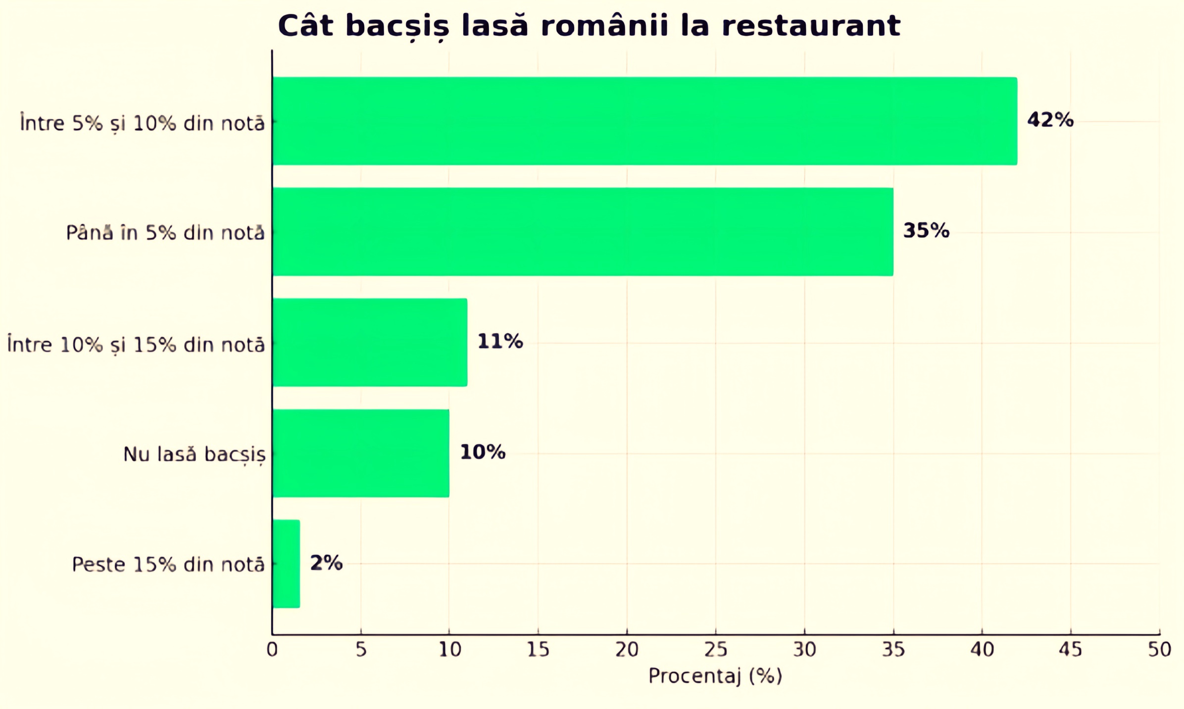Deși ieșirile s-au rărit, bacșișul nu a dispărut, dar s-a diminuat. 77% dintre români lasă sub 10%, iar 1 din 10 nu lasă nimic. Motivele sunt variate: de la servicii slabe (56%), la lipsa banilor cash (25%) sau pur și simplu convingeri personale.